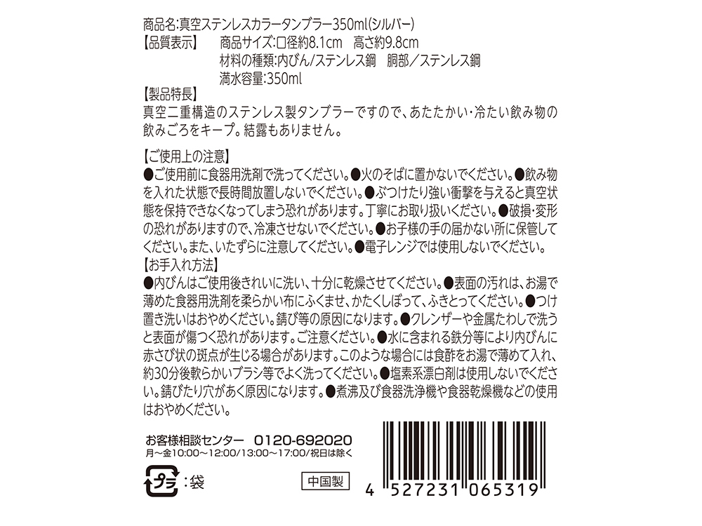 | 商品名 | 真空ステンレスカラータンブラー 350ml 1個 |