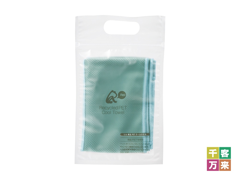 ペットボトルや食品トレーなどを回収し、再生繊維として有効利用した環境負荷の低いクールタオルです。90×800mmの使い勝手の良いサイズで、タオル先端のループに通すだけで簡単に首元へ装着できるため、アクティブに動くシーンでもズレにくいのが特徴です。水が蒸発する際の気化熱効果を利用して、首元を効率よくひんやりと冷やします。再生PET素材であることを示す控えめなロゴ入りで、シンプルかつ洗練されたグリーンカラーは、使う人の年齢や性別を選ばず、環境意識の高さをさりげなくアピールできる一品です。