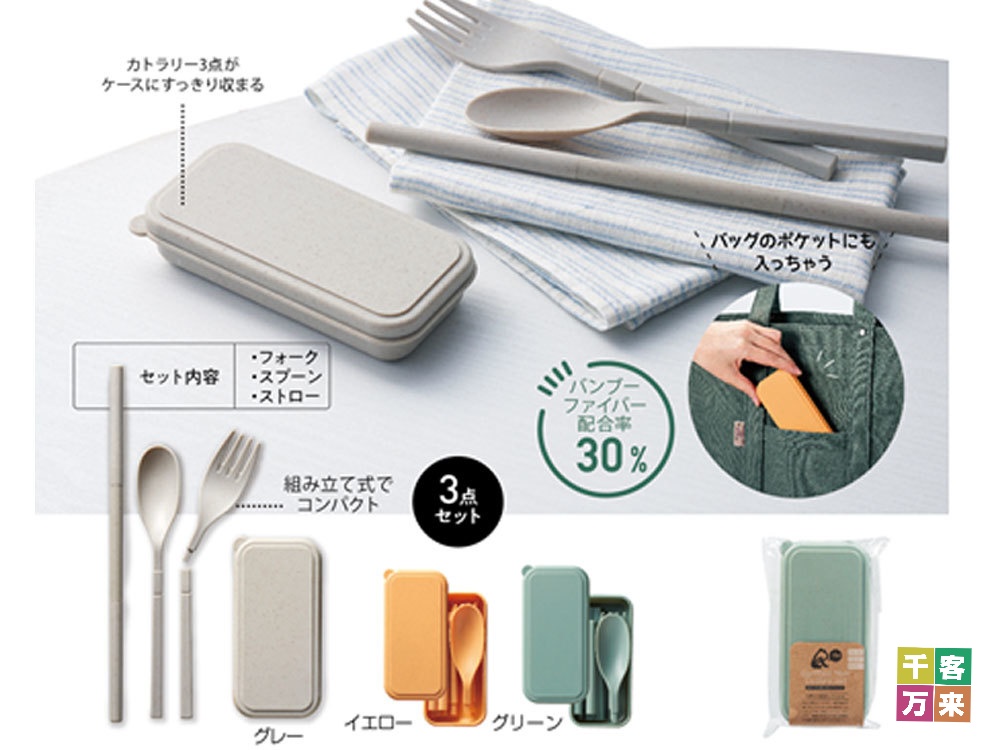 成長の早い竹を原材料とした「バンブーファイバー」を30%配合した、環境負荷の少ないカトラリーセットです。フォーク、スプーン、ストローの3点がセットになっており、それぞれ持ち手部分を差し込む「組み立て式」を採用することで、カバンやポケットにも収まる驚きのコンパクト収納を実現しました。落ち着いた色合いの色展開で、専用ケースにすっきりと収まる機能美が魅力です。使い捨てプラスチックを減らす「マイカトラリー」としての実用性は、受け取った方の環境意識を高めるきっかけとなります。