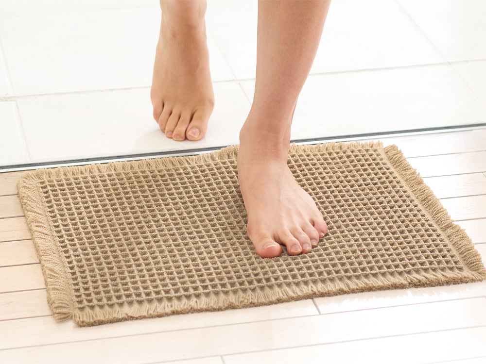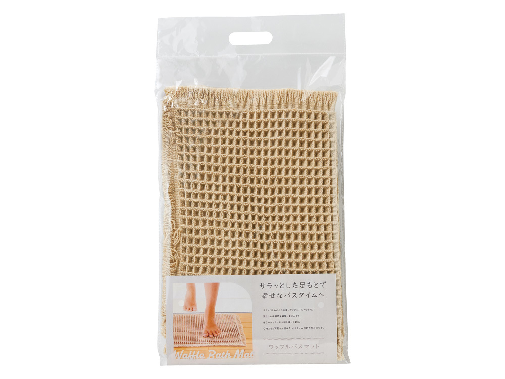 さらっと快適な踏み心地が魅力のワッフルバスマットです。独自の凹凸構造が足裏の水分を素早く吸収し、通気性にも優れているため乾きやすく、ベタつきを防いで清潔感を保ちます。軽量で洗濯しやすく、毎日のお手入れも簡単です。シンプルなデザインはどんなバスルームにも馴染みます。実用的な生活雑貨として、成約記念品や展示会の来場特典、引っ越し祝いなどのノベルティやギフトにも最適な一品です。