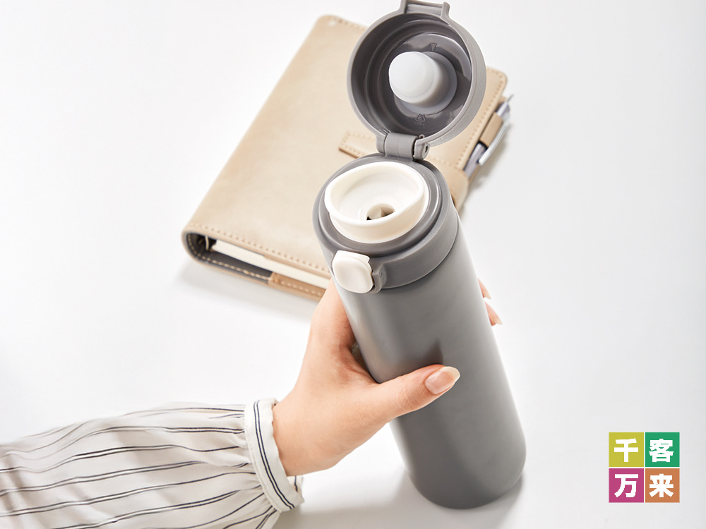 ボタンをスライドして押すだけで蓋が開く、利便性に優れたワンプッシュタイプのボトルです。真空構造により、冷たい飲み物は冷たく、温かい飲み物は温かいまま、最適な温度を長時間キープします。飲み口は直接飲めるダイレクトタイプで、広口設計のため氷も入れやすく、お手入れも簡単。底面には滑り止めが付いており、デスク上や不安定な場所でも安心して使用できます。スタイリッシュなブルーとグレーの2色展開で、本体に貴社のロゴを名入れすれば、アクティブな毎日を支えるパートナーとして、お客様の暮らしに深く浸透します。