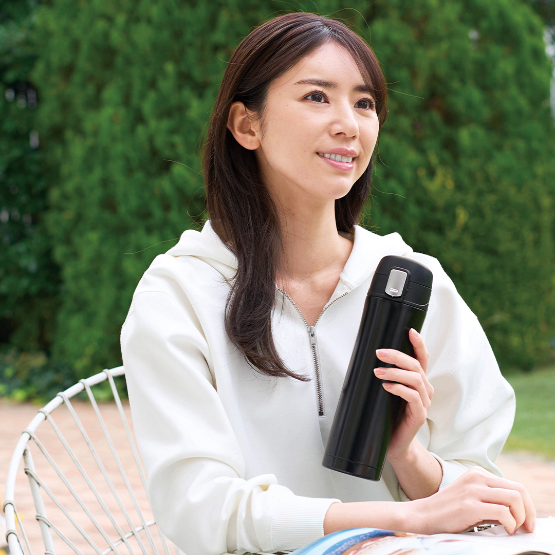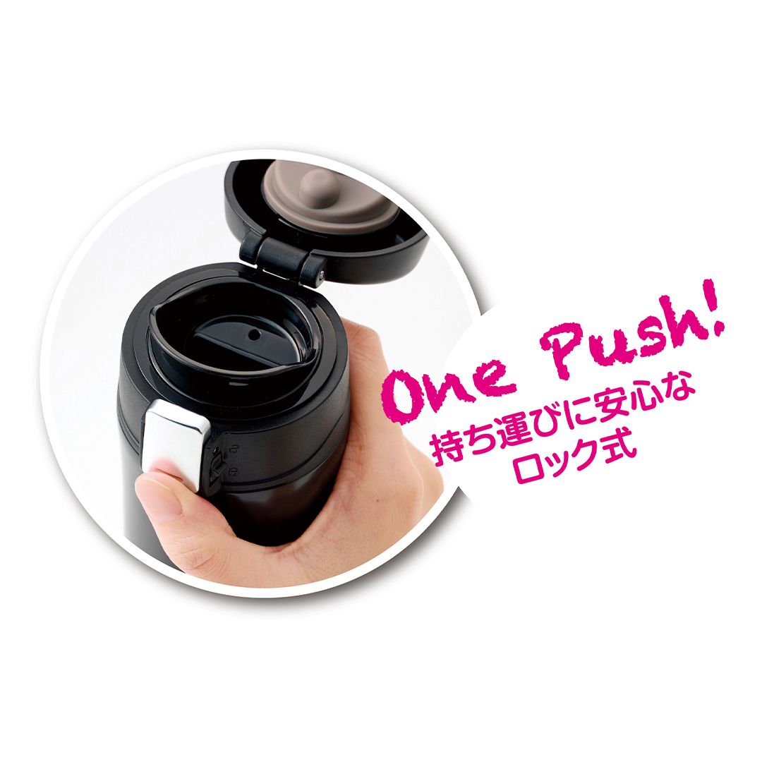 片手で簡単に開閉できる「ワンプッシュ真空ステンレスボトル」 。