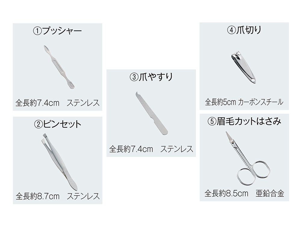 | 材質・成分 | ケース/PVC・カーボンスチール プッシャー/ステンレス ピンセット/ステンレス 爪やすり/ステンレス 爪切り/カーボンスチール 眉毛カットはさみ/亜鉛合金 |