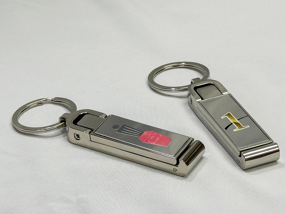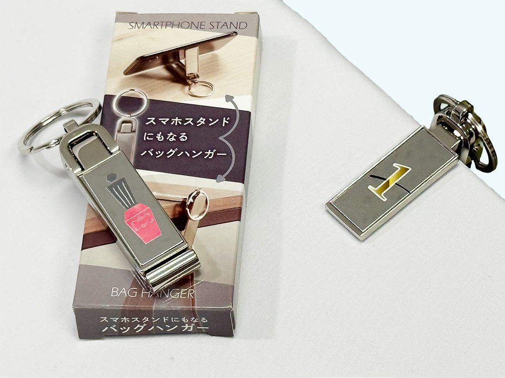 スタイリッシュで名入れ映えするデザインが大人気!キーホルダータイプのバッグハンガーは、画像の通りスマホスタンドにもなる便利アイテム。パット印刷代金で半永久的に名入れが残るレーザー印字での名入れが可能!レーザーマーキングで名入れをすると、印刷剥がれの心配が無くよりお洒落でクールなグッズになります。コンパクトで持ち歩きやすく、ノベルティとして配りやすいのもポイント。展示会でのノベルティや卒業記念品としてもお薦めの【スマホスタンドにもなるバッグハンガー】。勿論フルカラー印刷にも対応しております。