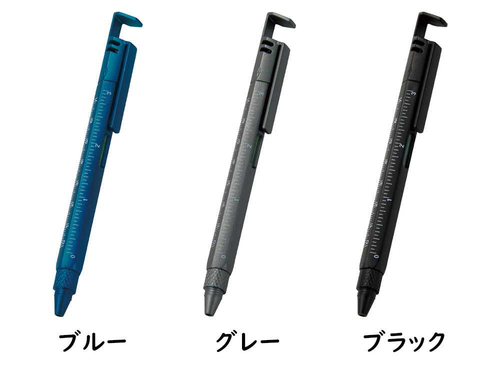搭載機能: スマホスタンド|ボールペン | プラスドライバー | マイナスドライバー | 水平器 | 3種のスケール(定規)