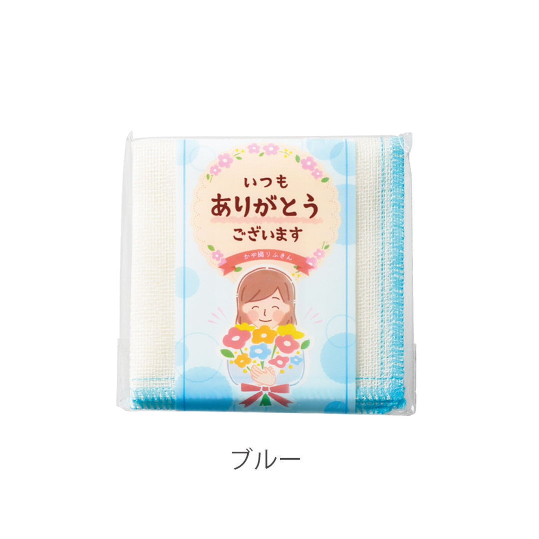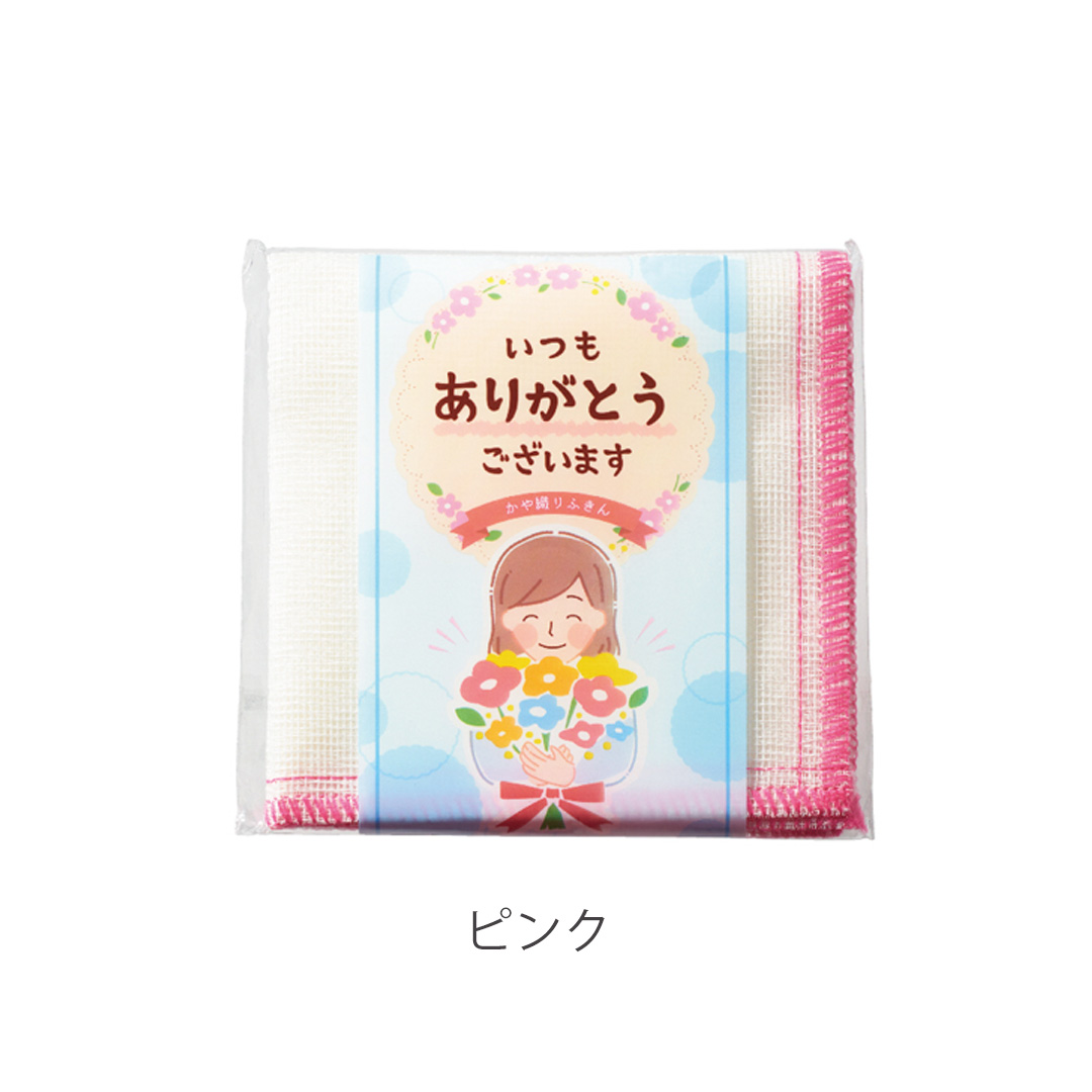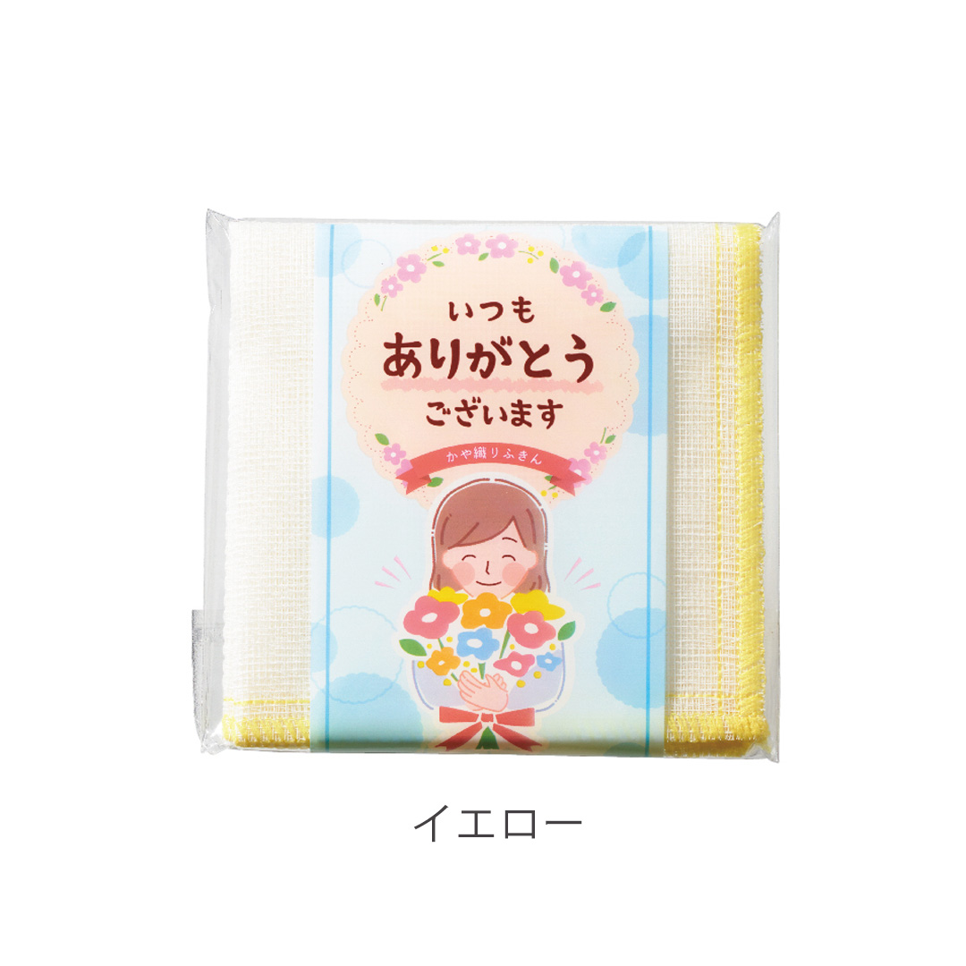 家庭で使える販促品の定番かや織りふきん。パッケージに感謝の言葉をデザインしました。