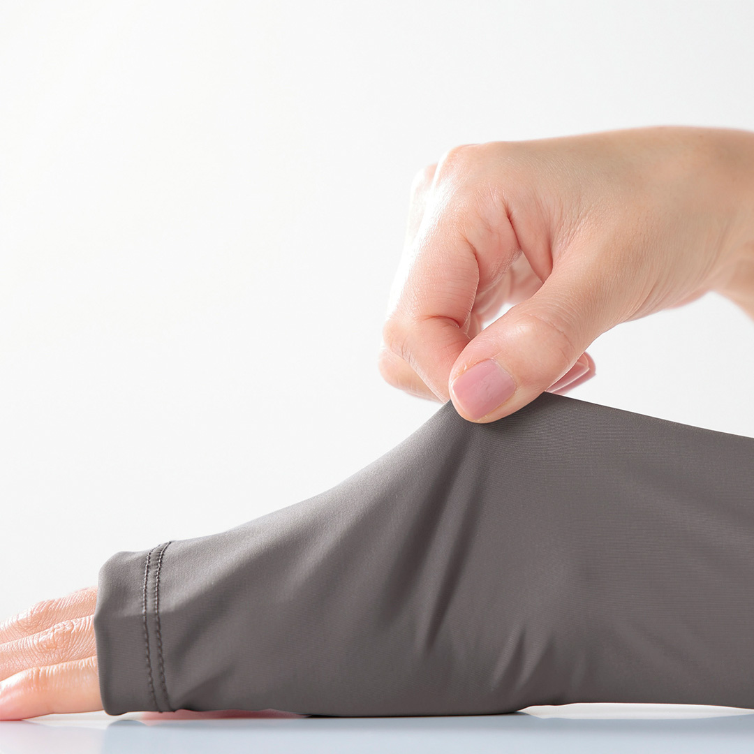 夏でも快適な接触冷感生地のUVケアグローブです。親指穴付きでズレにくく、手の甲までしっかり守れます。