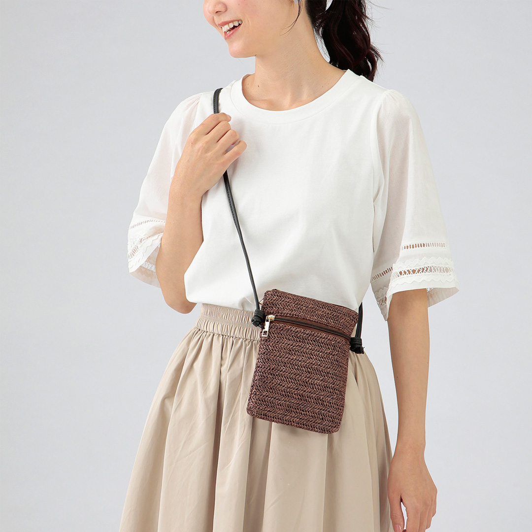 季節の彩りを手軽に取り入れられる、涼しげな雑材風のショルダーバッグです。天然素材のようなナチュラルな表情を楽しみつつ、丈夫で軽やかな素材感を実現しました。スマートフォンや財布など、必要なものだけをスマートに持ち運べるコンパクトなサイズ設計。扱いやすく、デイリーのちょっとした外出を夏らしく軽快に演出してくれるアイテムです。