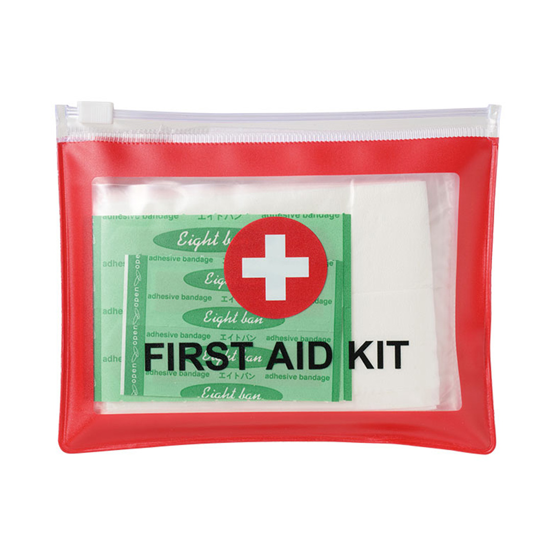 いざという時に備えておきたい、コンパクトな救急セットです。 防災意識が高まる中、災害対策として防災グッズだけでなく、応急処置に備えた救急グッズも重要です。 日常生活の中でも身近に置いておきやすい、シンプルなデザインのセットになっています。 薄くてコンパクトなサイズなので、通勤・通学時のバッグに入れて持ち歩いたり、災害時にもすぐ持ち出せるのが特長です。 セット内容は、ポーチ、応急処置の方法が書かれたマニュアルカード、ばんそうこう(M×2・S×2)、マスク、ポケットティッシュ。 ポーチにまとめて収納されているため、必要に応じてご自身で薬などを追加してカスタマイズすることもできます。 官公庁や自治体、企業の安全啓発行事での配布品としてはもちろん、防災訓練や防災イベントでの配布にもおすすめ。 日常でも備えとして役立つ実用的な防災グッズです。