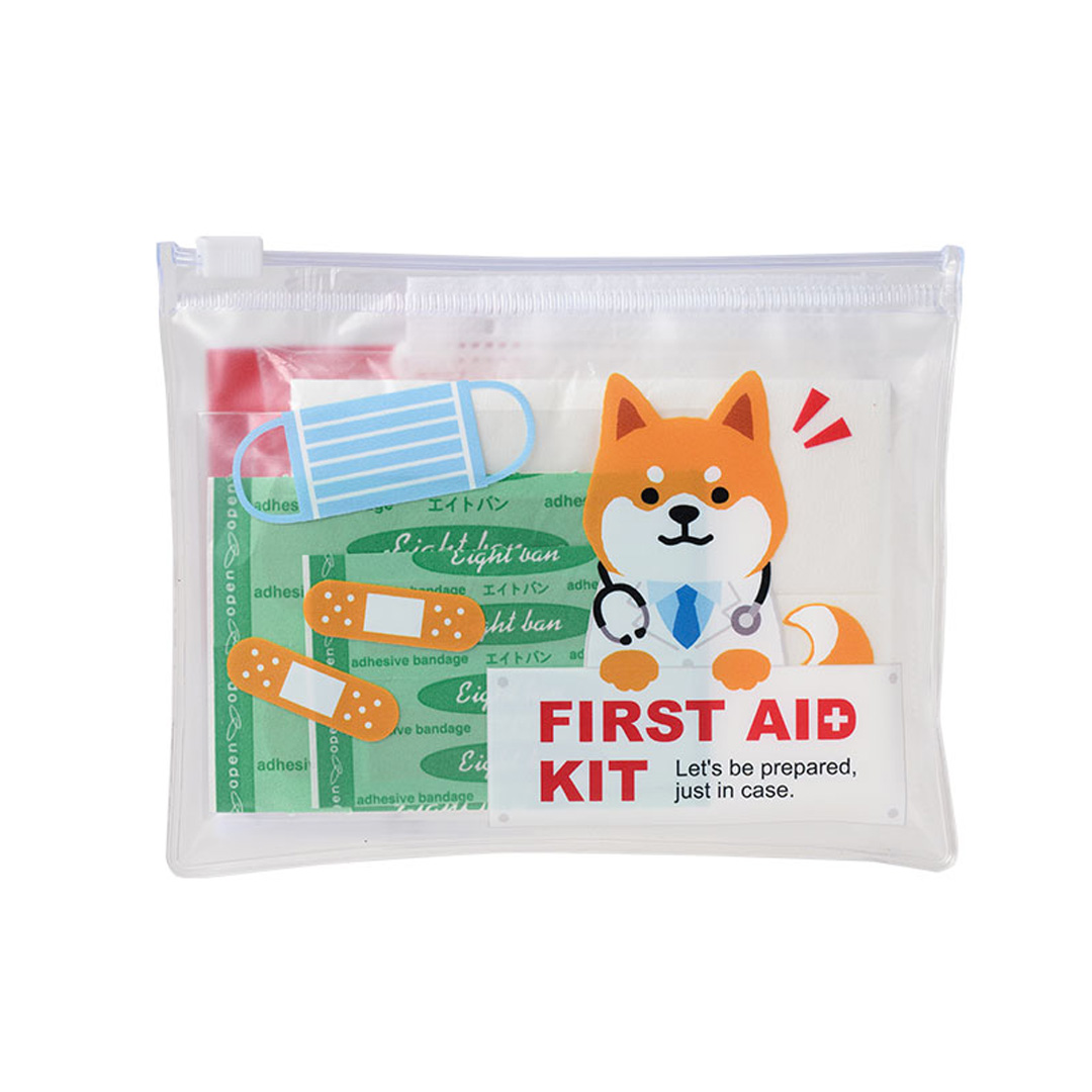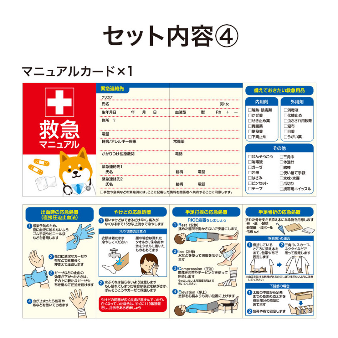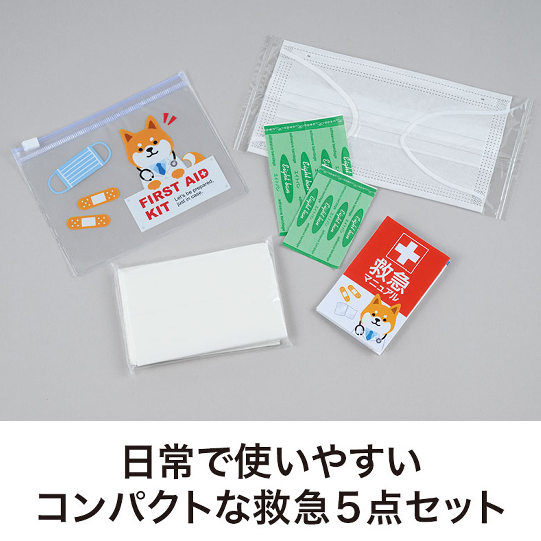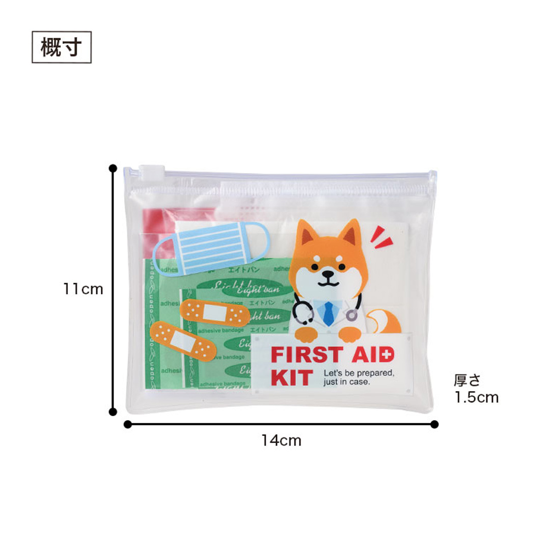 いざという時に備えておきたい、コンパクトな救急セットです。 防災意識が高まる中、災害対策として防災グッズだけでなく、応急処置に備えた救急グッズも大切です。 「わんわんドクター」のやさしいアニマルデザインで、非常時でも気持ちを落ち着かせてくれるようなポーチに仕上げました。 薄くてコンパクトなサイズなので、通勤・通学時のバッグに入れて持ち歩いたり、災害時にもすぐ持ち出せるのが特長です。 セット内容は、ポーチ、応急処置の方法が書かれたマニュアルカード、ばんそうこう(M×2・S×2)、マスク、ポケットティッシュ。 ポーチにまとめて収納されているため、必要に応じてご自身で薬などを追加することもできます。 官公庁や自治体、企業の安全啓発行事での配布品としてはもちろん、防災訓練や防災イベントでの配布にもおすすめ。 ポーチの裏面は無地のため名入れも可能で、オリジナルの防災啓発グッズとして活用しやすい商品です。
