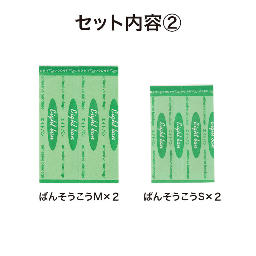 【5点セット内容】 ・ポーチ×1 ・マニュアルカード×1 ・ばんそうこう(M×2/S×2) ・マスク×1 ・ポケットティッシュ×1 ※ばんそうこう/エイトバン 医療機器届出番号 27B3X00138000001 |
