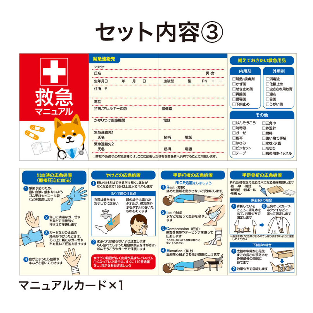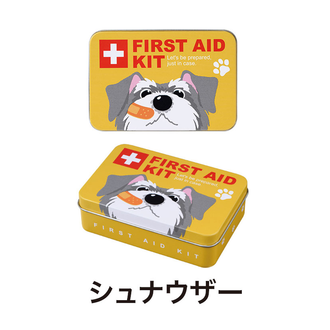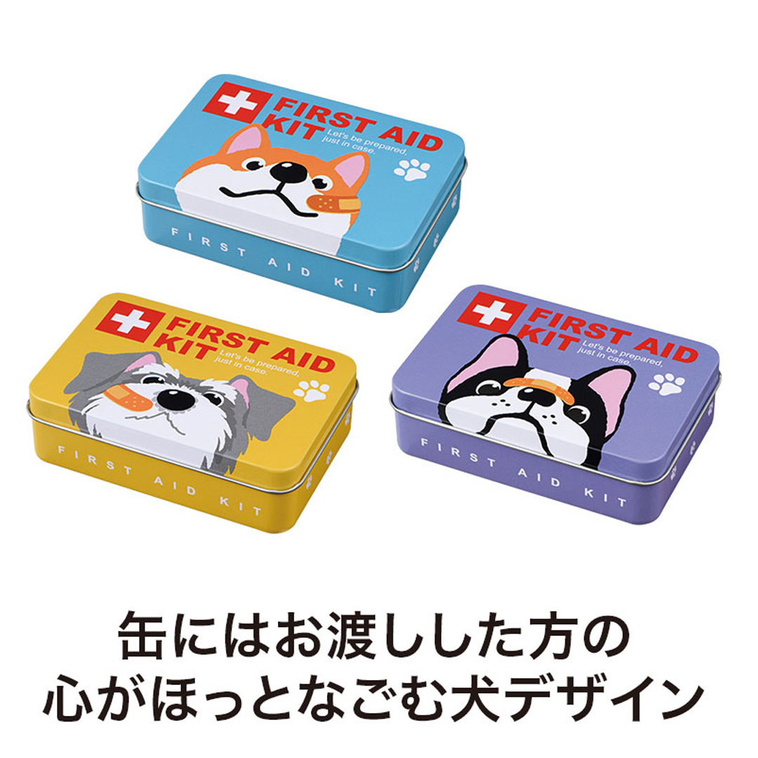 いざという時に備えておきたい、コンパクトな救急セットです。 防災意識が高まる中、災害対策として防災グッズだけでなく、応急処置に備えた救急グッズも重要です。 かわいい犬のデザインをあしらった小さな缶に、必要なアイテムをまとめた応急セット。 親しみやすいイラストで、受け取った方にもやわらかい印象を与えてくれます。 セット内容は、缶、応急手当の方法をわかりやすく記載したマニュアルカード、PBT包帯、サージカルテープ、はさみ、ばんそうこう(M×2・S×2)。 小さな缶の中に基本的な応急用品をしっかりと備えており、いざという場面でも役立ちます。 コンパクトなサイズなので、バッグや引き出しに入れておきやすく、緊急時にもすぐ持ち出せて便利です。 官公庁や自治体、企業の安全啓発行事などでの配布品としてはもちろん、防災訓練や防災イベントにもおすすめ。 実用性が高く、受け取った後も長く使っていただける防災グッズです。 缶のデザインは柴犬・フレンチブルドッグ・シュナウザーの愛らしい3種取り混ぜとなります。