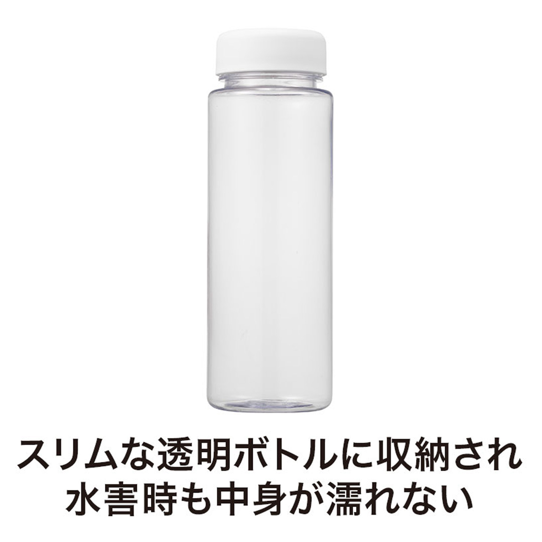 いざという時に備えておきたい、スリムなボトル入りの救急セットです。 防災意識が高まる中、災害対策として防災グッズだけでなく、応急処置に備えた救急グッズも大切です。 持ち運びしやすいボトルに、応急手当に役立つアイテムをまとめた便利なセットになっています。 セット内容は、ボトル、応急手当の方法をわかりやすく記載したマニュアルカード、PBT包帯、サージカルテープ、ばんそうこう(M×2・S×2)、とげ抜き、圧縮不織布タオル(2個)、マスク(2枚)。 ケガの手当てに使える基本的な用品に加え、「もしも」に備えたアイテムを揃えています。 スリムタイプのボトルにすっきり収納されているため、バッグに入れて持ち歩きやすく、災害などの緊急時にもすぐ持ち出せて便利です。 水害時でも中身が濡れにくく、安心して保管できます。 防災訓練や防災イベント、自治体や企業の安全啓発行事などでの配布品としておすすめ。 ボトル本体には会社ロゴやキャラクター、イベント名などの名入れも可能で、オリジナルの応急グッズとして手軽に作成できます。 実用性が高く、受け取った後も長く使っていただきやすいアイテムです。